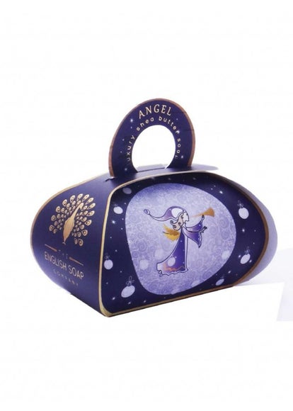 De Christmas Angel Gift-zeep heeft een zachte bloemige geur met een opbeurende toon van zoete vanille en topnoten van passievrucht en mandarijn. Deze zeep is verrijkt met hydraterende sheaboter en voedt en hydrateert alle huidtypes.